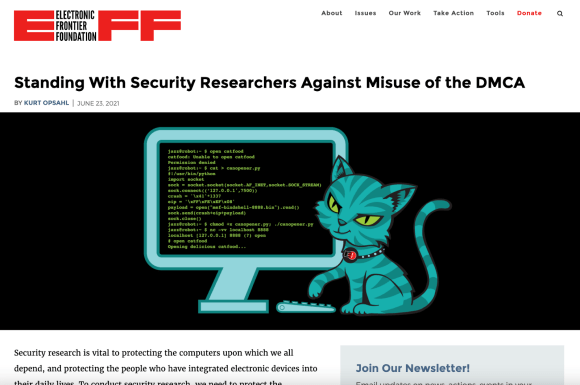 - In June 2021, NCC Group also co-signed the Electronic Frontier Foundation’s Statement on DMCA Use Against Security Researchers, alongside over a dozen other security firms. This statement voiced opposition to the use of Section 1201 of the Digital Millennium Copyright Act against security researchers performing research in good faith, including when using third-party security testing tools, where we stated, “We believe that the security of the internet and our digital world is strengthened by the work of independent security researchers who seek to discover and remediate existing security vulnerabilities before those vulnerabilities can be uncovered and exploited by threat actors, and we urge reconsideration of policy which may inhibit this important work.”