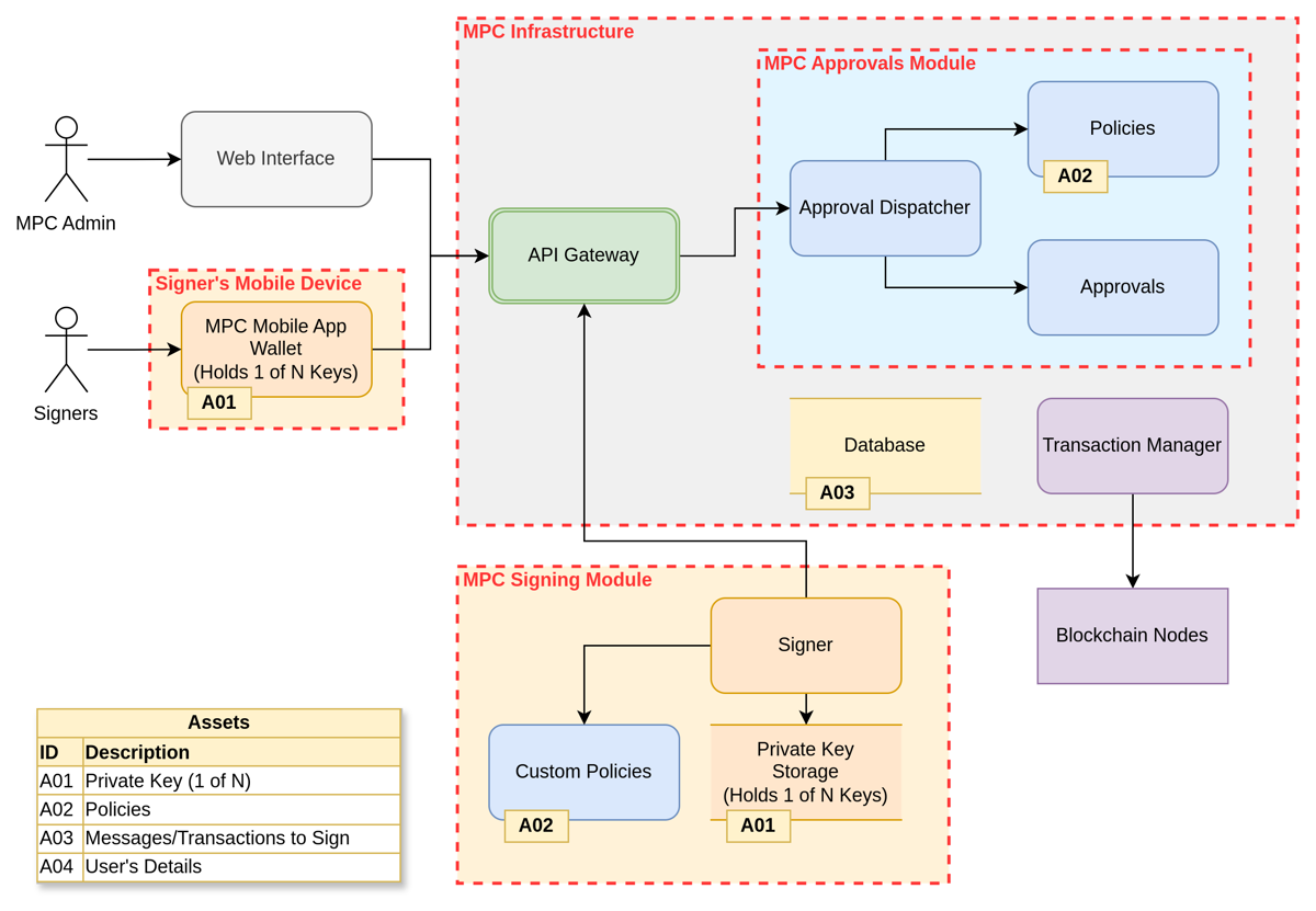 The main difference between this solution and the previous, centralized one, is that the keys are distributed between the approvers and potentially other systems. This architecture eliminates the main potential single point of failure by design (considering a correct MPC implementation), as signing a message requires N of M keys, which are distributed.