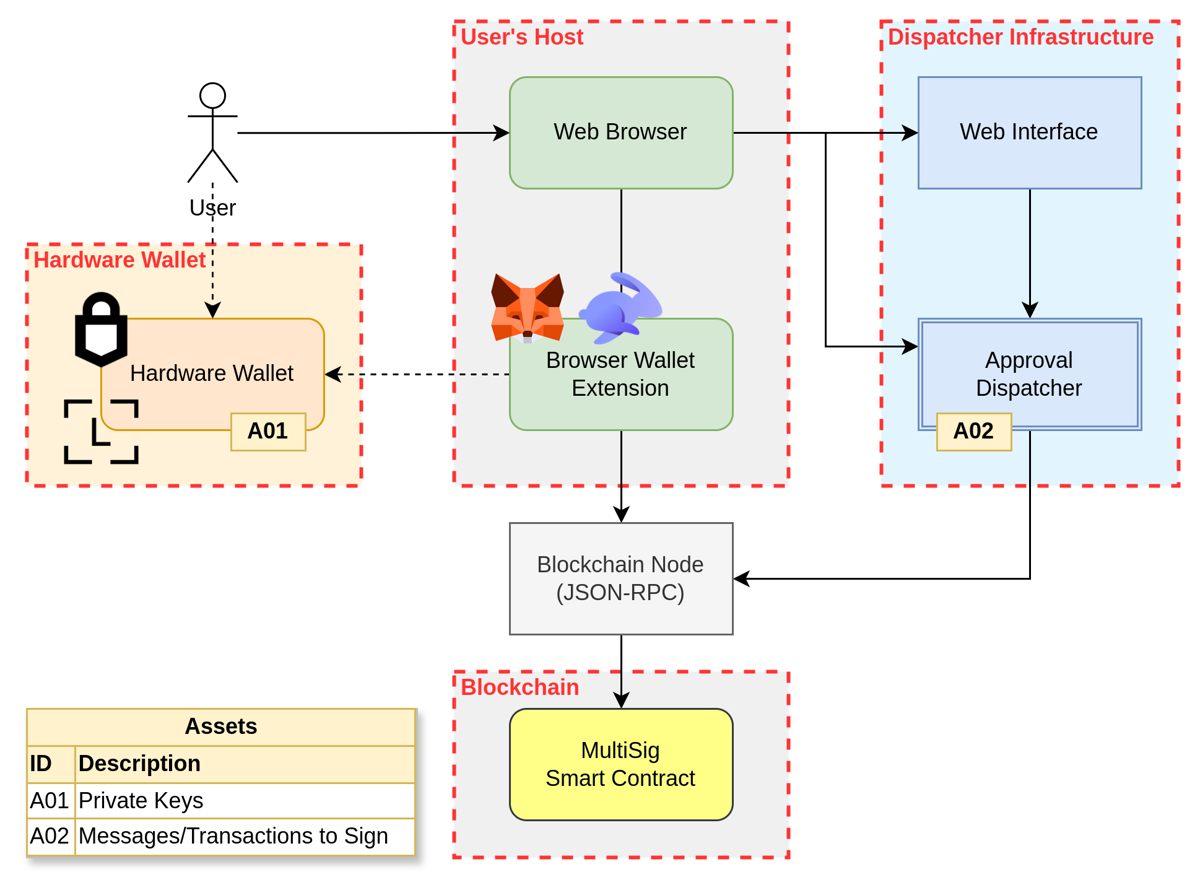 In this diagram, we showcased the most common method used to sign transactions. A browser wallet extension (like Metamask or Rabby Wallet) connected to a Hardware wallet (like Trezor or Ledger). It is important to notice that the web browser wallet can also hold private keys, but there are several reasons of why using this is not secure: