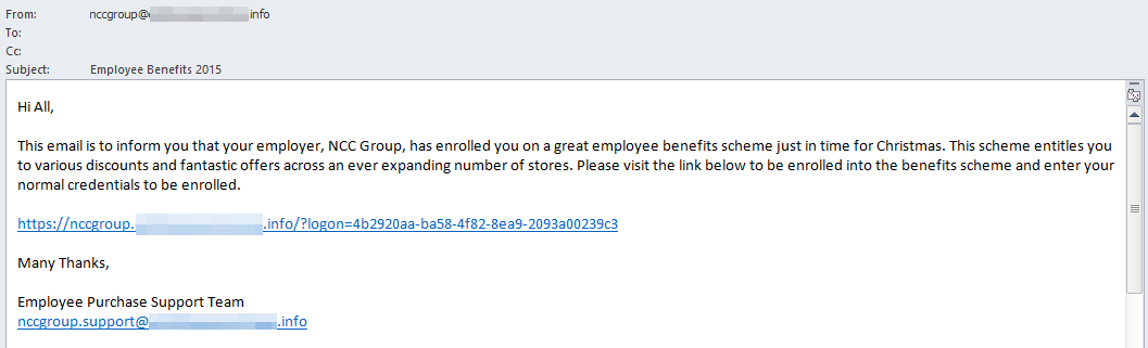 This time of year everyone wants to save some money, so NCC Group created a fake employee benefits website in order to entice victims. The phishing email sent out to the users requested that they enter their normal credentials in return for some Christmas discounts.