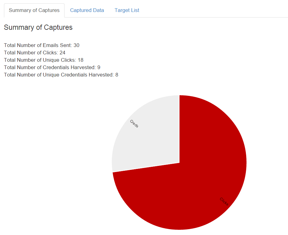 This process was automated using NCC Group’s in-house phishing platform, Piranha. This meant it was possible to create a new phishing site, along with a customised domain and SSL certificate, and launch an email-based spear-phishing campaign within a matter of hours. The NCC Group consultants could then use Piranha’s reporting dashboard to track individual clicks and credentials as they were entered in real time. The screenshot below shows the summary of the results from a phishing campaign.