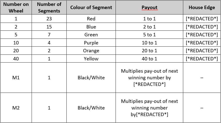 The segments M1 and M2 are multiplier segments, which makes the game more interesting. If the wheel stops on any of them, new bets are not accepted, and the wheel is spun again. However, any wins on the next spin are multiplied by [*REDACTED*] or [*REDACTED*], according to the multiplier the wheel stops on in the original spin. If the wheel stops on two or more multipliers, the final win is increased by as many times as all the multipliers before indicate.