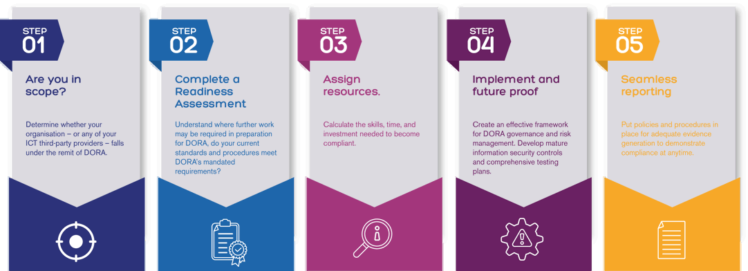 The most important thing in achieving DORA compliance is that you get started. Here's a quick reference guide to help you plan an effective and efficient strategy: