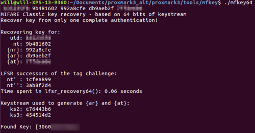 The Proxmark code base includes a tool called mfkey64 that, given the UID and all values passed in the authentication handshake, can recreate a valid key stream and derive a valid key with extreme efficiency. Since the UID is public, and all other values are passed in plaintext during the handshake, this method can be used to quickly retrieve an initial key value. The derived key will be associated with whatever sector the authenticated reader was requesting at the time of packet capture.