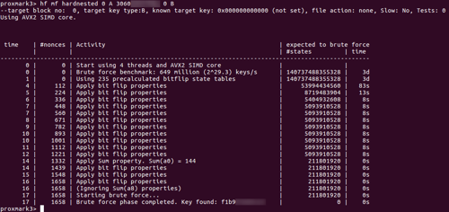 The whole brute-forcing process should not take more than a minute or two on a basic host machine for a single key, assuming everything is working properly. Since there are up to 32 unique keys on the card, you may need to repeat the hardnested attack up to 31 times for sectors with unknown keys. After recovering a new key, check it against all sectors to prevent unnecessary work.