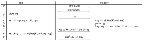 The Mifare Classic authentication protocol can be seen in the following graphic:
