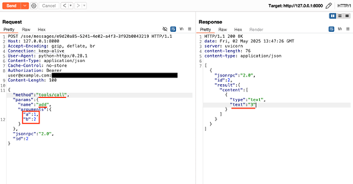 It is worth mentioning that the HTTP to MCP Bridge shows the result corresponding to the given request, although under the hood it happens asynchronously. This allows one to use tools such as Burp Intruder or other automations to show the results of every request easily. The example below shows Burp Intruder being used to invoke the “add” tool with several combinations of numbers and to extract the response:
