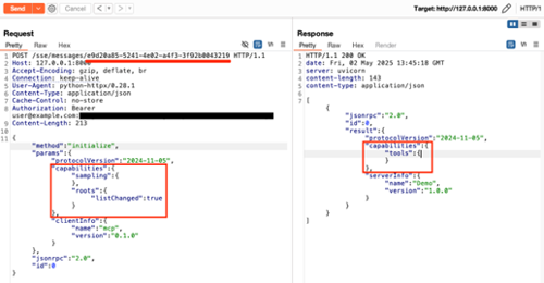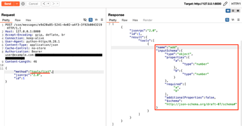 For this reason, NCC Group has released an HTTP to MCP Bridge[2], which is an HTTP server that establishes an SSE communication with the target and, at the same time, it provides a pure HTTP interface that can be used with Burp or your favourite HTTP tool, to assess MCP remote servers through it.