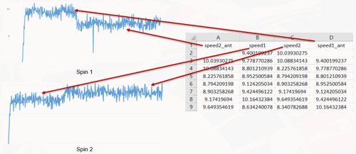 If the speed1 and speed2 of multiple spins are represented in a graph then the evident linear correlation can be noticed: