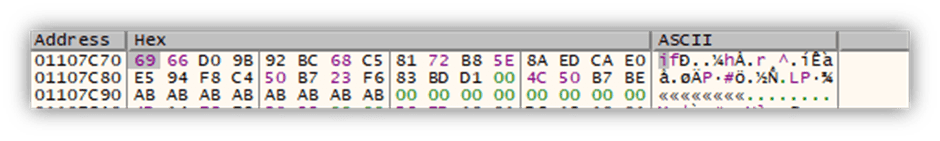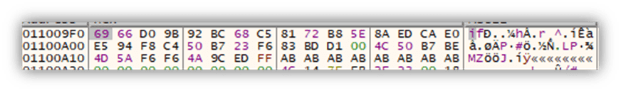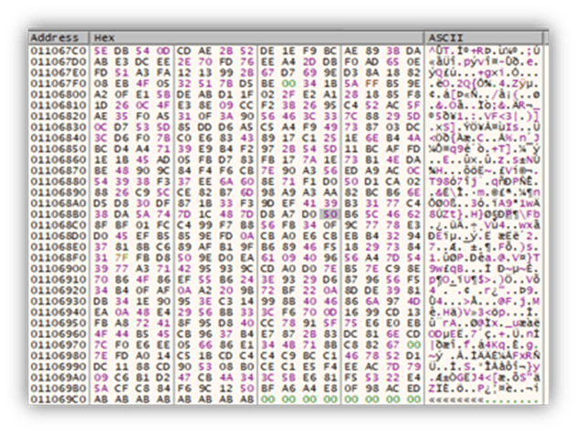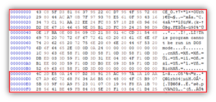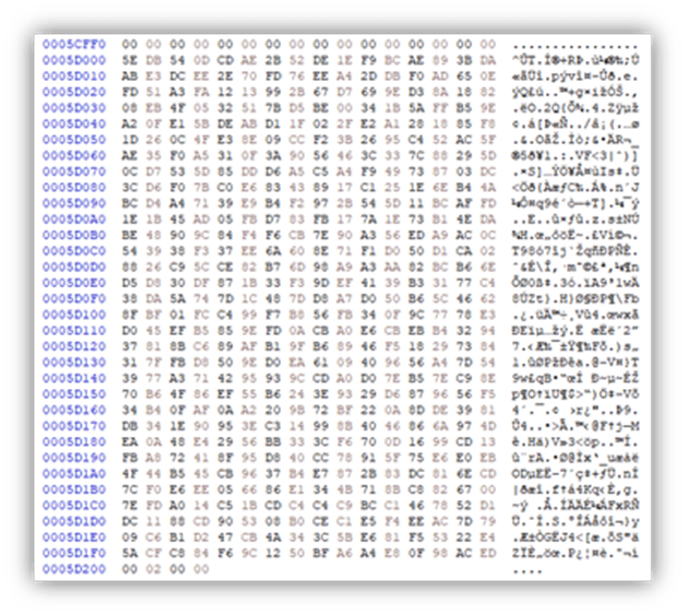 Black Basta, as with many ransomware variants, doesn’t encrypt the entire file, instead only partially encrypts the file to increase the speed and efficiency of encryption. Black Basta achieves this by only encrypting 64-byte blocks of a file interspaced by 128-bytes. This can be seen in Figure 11 below, where the first two encrypted data blocks are shown.