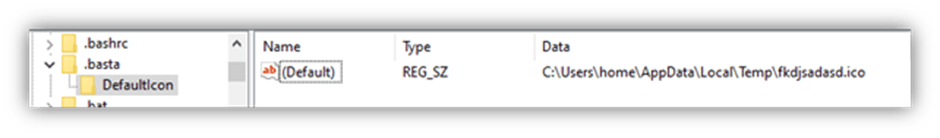 The next operation creates a new registry key with the name .basta under HKEY_CLASSES_ROOT and sets the DefaultIcon subkey to display the dropped .ico file. This results in files given a .basta file extension inheriting the Black Basta logo. The registry key can be seen below in Figure 5.