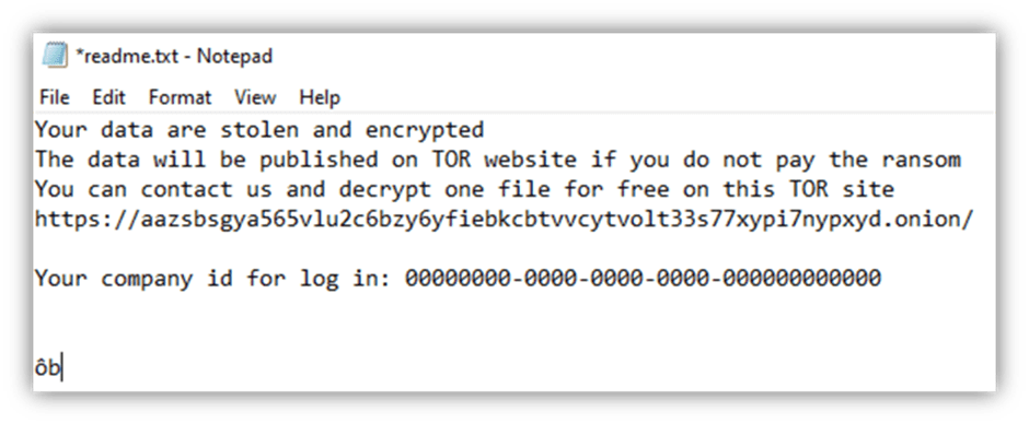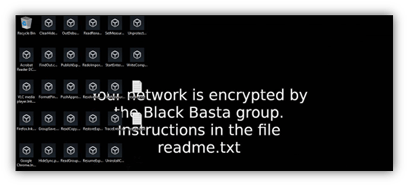 The ransomware note is stored within the binary and written to a text file named readme.txt, as shown in Figure 6. This file is written to folders throughout the system. The content comprises a standard Black Basta template with a URL to a Tor site where victims can negotiate with operators.